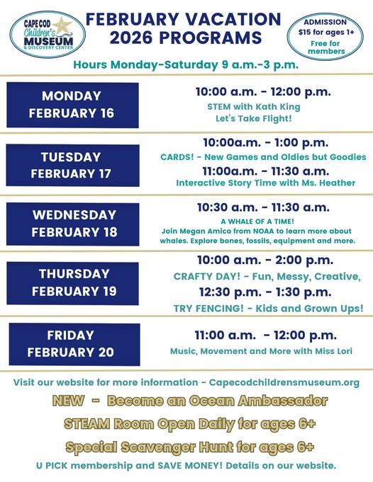 Specialty Weeks, Feb/April/Dec Holiday breaks: Hours are 9 am – 3 pm and admission is $15.00 per person. Members are Free!