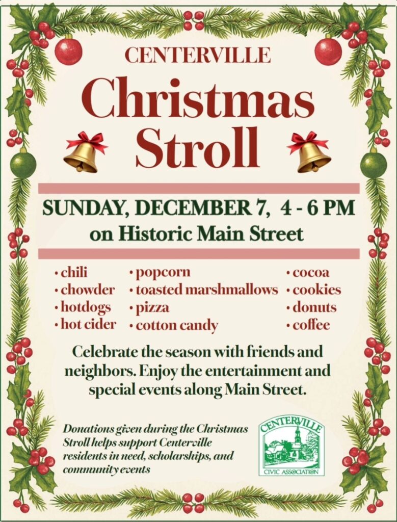 Centerville Christmas Stroll will be held on Sunday December 7th   from 4-6pm Enjoy delicious snacks while celebrating the season with friends and neighbors and enjoying the entertainment and special events along Main Street.   Have the kids visit Santa, see ice sculptures  and get into the holiday spirit with the families.