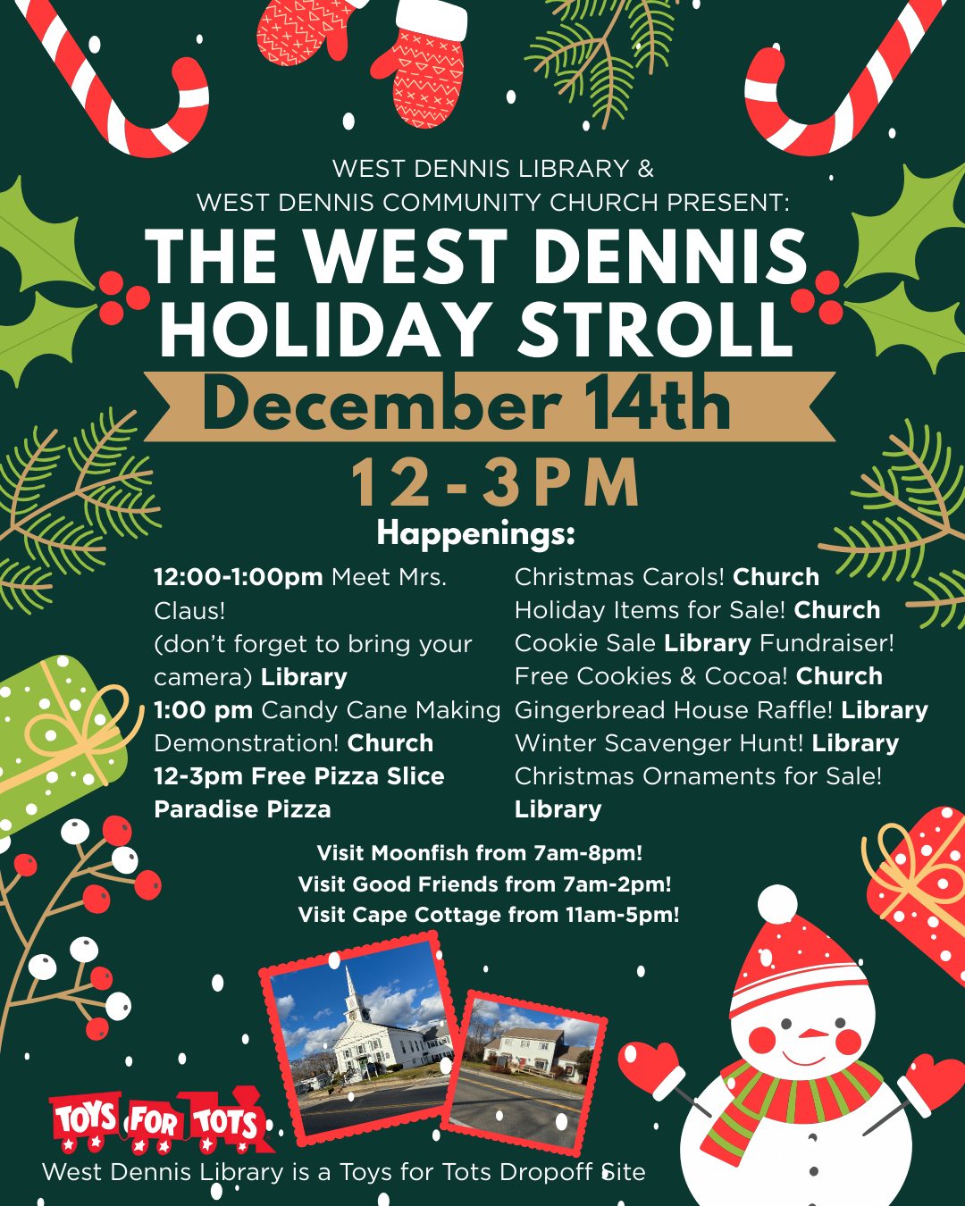 The West Dennis Library and West Dennis Community Church are teaming up once again to bring some serious holiday cheer to town. On Sunday , December 14th, from 12–3 PM, families are invited to bundle up, stroll through the village, and enjoy a whole lineup of festive happenings during The West Dennis Holiday Stroll.