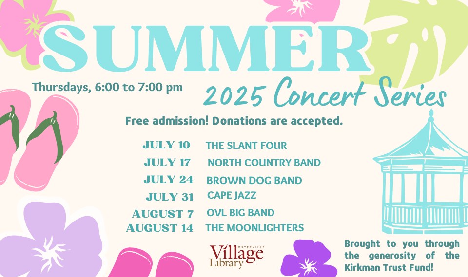 The Osterville Village Library 2025 Summer Concert Series features a different act or group each Thursday at 6pm on the library lawn.  Brought to you by the generosity of the Kirkman Trust Fund, will be held under the tent! Come rain or shine for this fun family-friendly event.