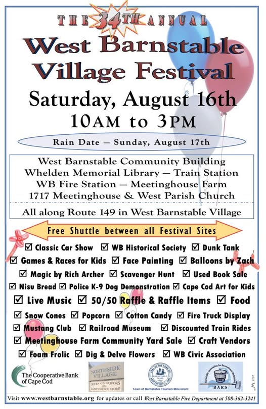The Annual West Barnstable Village Festival will be held on Saturday August 16th 10:00 am – 3:00 pm at along Meetinghouse way in West Barnstable.