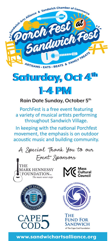 Sandwich  PorchFest  is taking place in beautiful, historic Sandwich Village  at Sandwich Fest  on Saturday  October 4th   1-5.  This is a free, family-friendly, outdoor event featuring twenty musical acts presented on ten porches, all within walking distance, with plenty of free parking.   Bring the family to this fun October Cape Cod event
