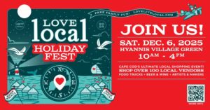 The LoveLocal Fest  Holiday Edition will be held on Saturday December 6th.  This year’s ultimate holiday shopping experience is set to take place on Saturday, December 2nd from 10am-4pm outside on the Hyannis Village Green + Harbor Overlook!    The Love Local Fest Holiday Craft fair & shopping event  will be part of Hyannis Holiday Weekend